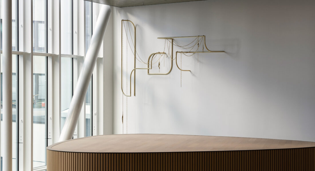 Painokuvio julkisivulaseissa ja veistosinstallaatio Sillalla.